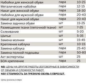 Ознакомьтесь с нашим полным прайс-листом на качественные услуги. Специалисты в своей области готовы помочь Вам с ремонтом и уходом за обувью, изготовлением ключей и даже в изготовлении наклеек! Мы найдем быстрое и практичное решение для Вашего запроса.